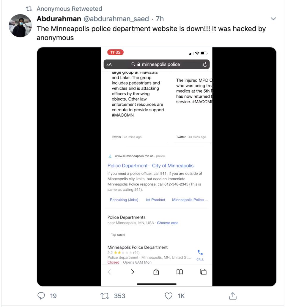 In a screen-captured photo that was obtained by Forbes, a Twitter user posted a screenshot that the official website of the Minneapolis Police Department was “down”, claiming that it was allegedly “hacked by Anonymous”. The said tweet was retweeted by Anonymous itself.