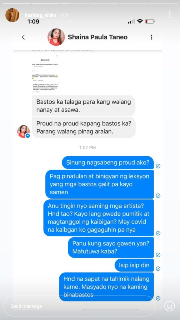 Her message was accompanied by a screenshot of Nikko’s interaction with another netizen.