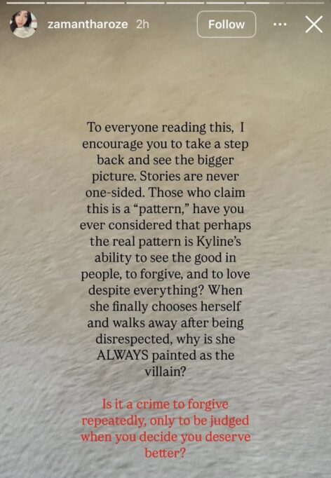 Zamantha expressed that any issues should have been resolved privately, not publicly. She emphasized that Kyline deserves to be treated with fairness and respect. She also called on the public not to judge based solely on one side, reminding them that stories always have multiple perspectives.