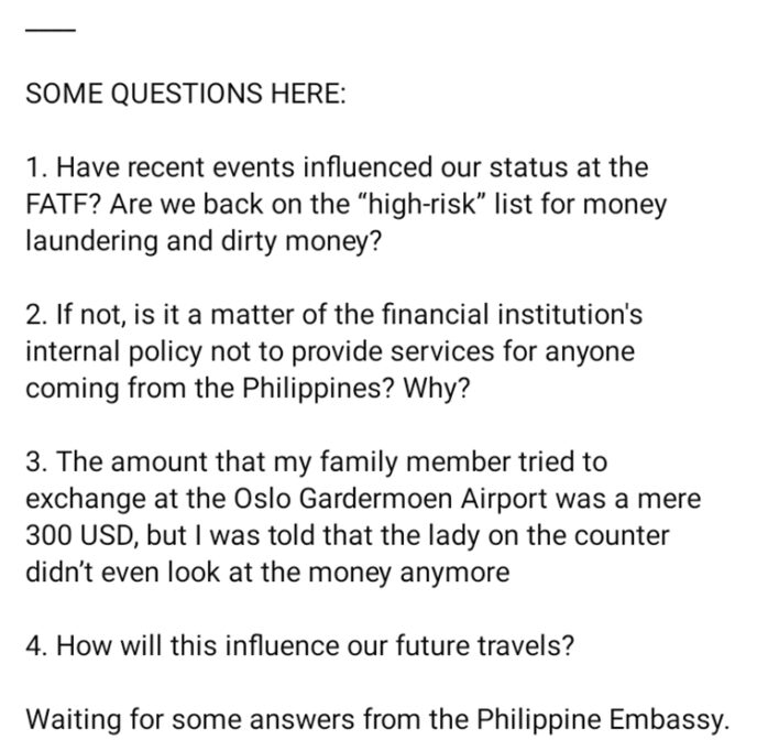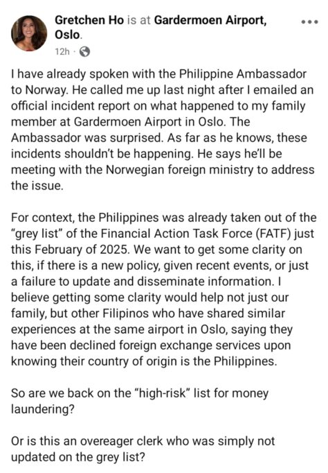 She said she wanted clarity—whether this was due to a new policy, outdated information, or simply a misunderstanding by the airport staff. Gretchen also mentioned that several other Filipinos have reported similar experiences at the same airport, being denied money exchange services once their nationality was known. “So are we back on the “high-risk” list for money laundering?” she asked. “Or is this an overeager clerk who was simply not updated on the grey list?”