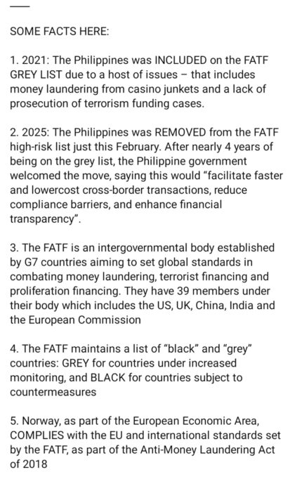 Gretchen explained that the Philippines was removed from the Financial Action Task Force (FATF) “grey list” in February 2025, after almost four years of being under increased monitoring due to concerns about money laundering and terrorism financing. Being taken off the list was seen as a positive development, allowing for faster and more transparent international financial transactions. Because of this, Gretchen questioned why her relative still faced such treatment.