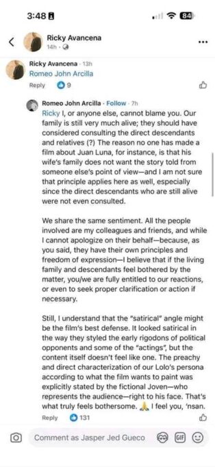 Arcilla, who became well-known for playing General Antonio Luna in Heneral Luna, agreed with his cousin’s statements. He said the filmmakers should have talked to the Quezon family before making the movie, explaining that their family is still alive and should have been consulted. He compared it to the case of national hero Juan Luna, saying that no one has made a movie about Luna because his wife’s family does not want others to tell the story from a different point of view. Arcilla clarified that he has no personal anger toward the filmmakers but believes that the Quezon family has the right to ask questions about how the film was made.