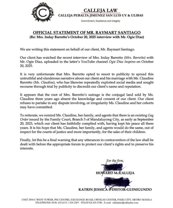 The lawyers added that Raymart has chosen to remain silent due to a gag order issued by the Mandaluyong Family Court in 2023. They urged Claudine and her family to respect the same order to protect their children’s privacy.