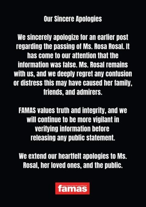 After the mistake spread online, FAMAS released an official statement of apology. The group admitted its error, apologized to Rosal’s family and supporters, and clarified that she is still alive. Their message read: “We sincerely apologize for an earlier post regarding the passing of Ms. Rosa Rosal. It has come to our attention that the information was false. Ms. Rosal remains with us, and we deeply regret any confusion or distress this may have caused her family, friends, and admirers.”
