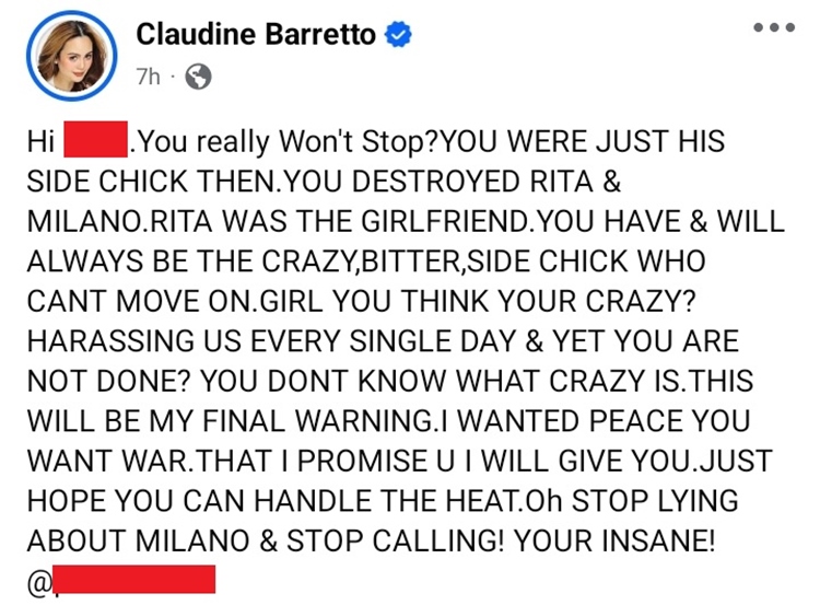 Claudine Barretto expressed her frustration in a series of emotional posts, saying that Patti had been harassing her and Milano on social media every day. She emphasized that she wanted peace but warned Patti to stop spreading lies about Milano and to stop contacting him.