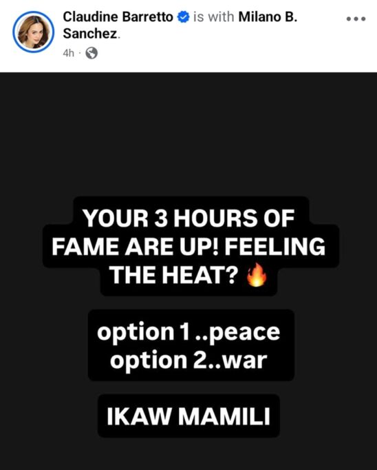CLAUDINE BARRETTO — The actress is currently making headlines after confronting a woman she called the “side chick” of her rumored boyfriend, Milano Sanchez, who happens to be the brother of broadcaster Korina Sanchez. The confrontation unfolded publicly through Claudine’s Instagram posts, where she directly addressed a woman named Patti.