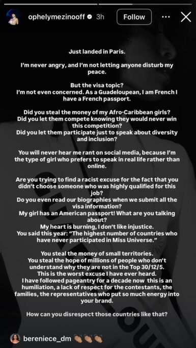 Ophely Mezino of Guadeloupe defended Yace publicly through her social media account. She said Rocha’s remarks showed a lack of respect not only for Yace but for all contestants and supporters of the Miss Universe pageant. She also questioned whether Rocha was simply trying to find an excuse to justify choosing a less deserving winner. Mezino added that Yace actually has an American passport, showing her frustration and saying she strongly dislikes injustice.