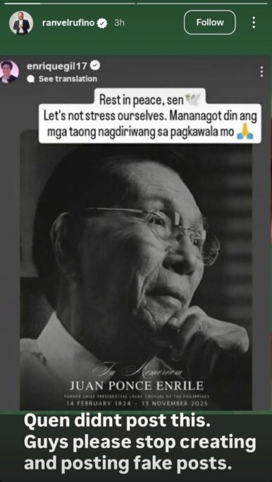 Before the clarification, online users reacted strongly to the supposed post from Enrique Gil. The deleted story featured a photo of Enrile with a caption that read, “Rest in peace, sen [white dove emoji] Let’s not stress ourselves. Mananagot din ang mga taong nagdiriwang sa pagkawala mo [praying hands emoji].” Many netizens criticized the message, calling it inappropriate and insensitive. Some noted that the post was even more questionable because Gil had once portrayed Enrile in an episode of Maalaala Mo Kaya.