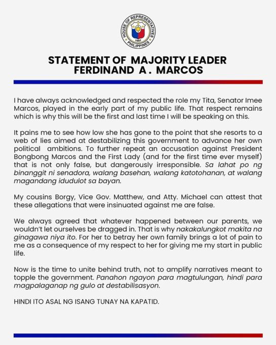 Because of this, he said it is painful to see Senator Imee doing something that goes against their family’s unity. He added that her actions hurt him even more because he has always respected her for helping him begin his career in public service.