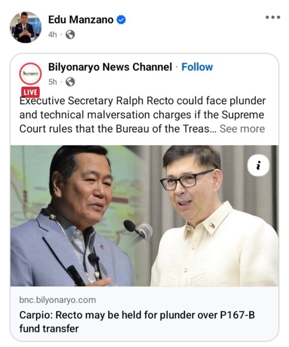 EDU MANZANO – The actor drew attention online by sharing an article suggesting that Executive Secretary Ralph Recto could face plunder charges.