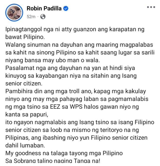 He added that the man involved should even be grateful the situation did not become more serious, since his actions were disrespectful, especially toward a senior citizen. Padilla also criticized people on social media who attacked Guanzon instead of supporting her. He found it ironic that some Filipinos praise those who speak out against foreign abuse in the West Philippine Sea, yet in this case, they were quick to turn against a fellow Filipino who defended herself.