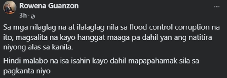 “Sa mga nilaglag na at ilalaglag nila sa flood control corruption na ito, magsalita na kayo hanggat maaga pa dahil yan ang natitira niyong alas sa kanila,” Guanzon noted. “Hindi malabo na isa isahin kayo dahil mapapahamak sila sa pagkanta niyo,” she added.