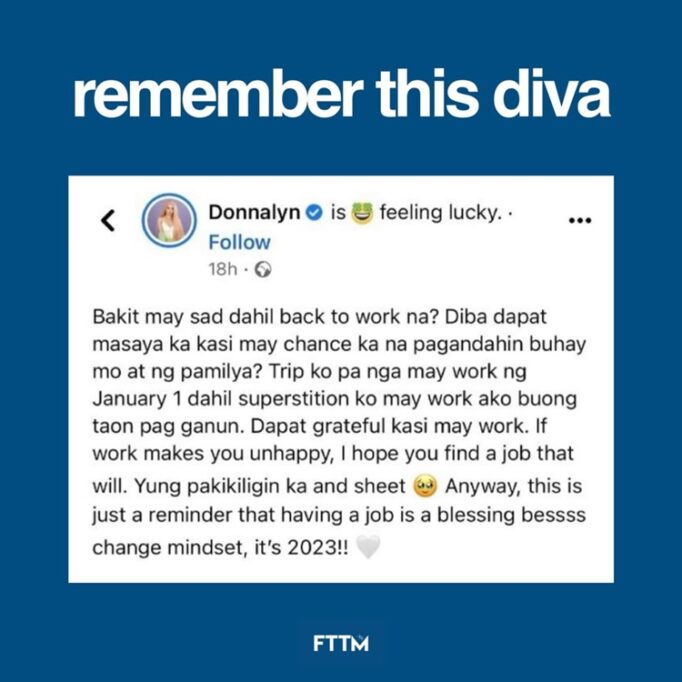 According to Donnalyn, she personally enjoys going back to work, especially on the first day of the New Year. She explained that, based on her superstition, having work on January 1 predicts continued employment throughout the year. She encouraged her followers to view returning to work positively, noting that having a job provides an opportunity to improve one’s life and the well-being of one’s family. She said people should be grateful for having work, rather than feeling upset.