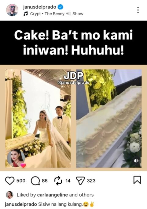 The issue began after Carla Abellana married her high school sweetheart, Dr. Reginald Santos. Photos from their wedding showed a simple, long, rectangular white cake with a minimal design. Some netizens found the cake’s shape unusual and compared it to a coffin, turning it into a meme. Janus joined the trend by sharing a photo of the cake with a joking caption implying it looked unfinished or strange. While many treated it as harmless humor, the post still attracted public attention because of Carla’s popularity.