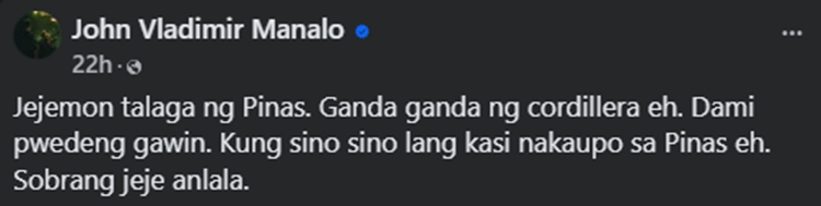 “Jejemon talaga ng Pinas. Ganda ganda ng cordillera eh. Dami pwedeng gawin. Kung sino sino lang kasi nakaupo sa Pinas eh. Sobrang jeje anlala,” he wrote.