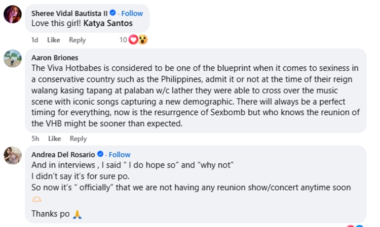 Andrea explained in an interview on “Fast Talk with Boy Abunda” that while fans have asked her about a reunion, nothing has been officially planned. She said that unlike the SexBomb Girls, the Viva Hot Babes were mostly actresses and models, not professional dancers. Although they would love to do a reunion, their different schedules and work, including acting projects and public service, make it hard to organize. Andrea also shared that she admires the SexBomb Girls and hopes they could collaborate someday if a reunion ever happens.