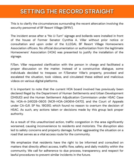 CYNTHIA VILLAR – The former senator released a statement explaining her side regarding the recent incident involving security personnel at BF Resort Village in Las Piñas City, which quickly spread online and drew mixed reactions from the public.
