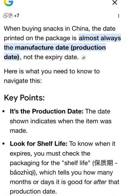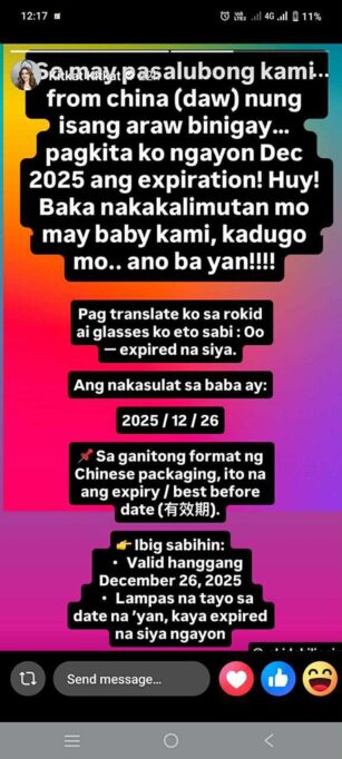 In her post, she shared that she noticed a date on the packaging and, after using a translation tool, concluded that the product was no longer safe to consume. She expressed concern because the item came from a close family member and mentioned her baby’s safety, which led her to question why such an item was given to them.