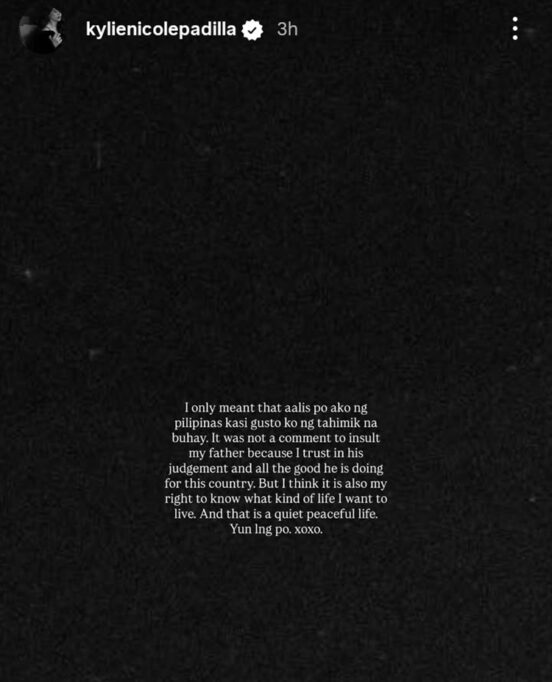 During a media conference for the film The Lotto Winners, Kylie was asked by reporters how she felt about her father potentially seeking a higher position in government. Laughing, she repeatedly said that if her father decided to run for Vice President, she might leave the Philippines. She made it clear that she had no serious comment on the issue and kept her tone light and humorous. However, when pressed further about whether she supports her father’s political career, Kylie gave a more sincere response, saying that she trusts her father’s judgment.