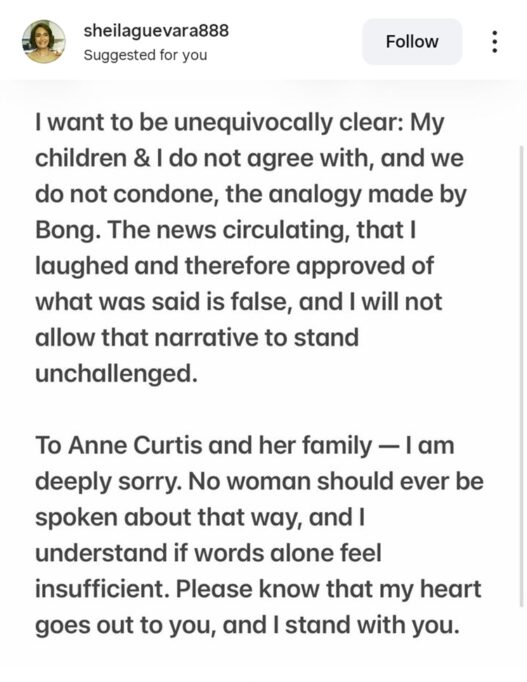 Sheila expressed sincere regret to Anne Curtis and her family, explaining that no woman should ever be spoken about in that manner. She acknowledged that words alone may not fully fix the situation, but she wanted them to know that she genuinely sympathizes with them and stands in support of women who deserve dignity and respect.