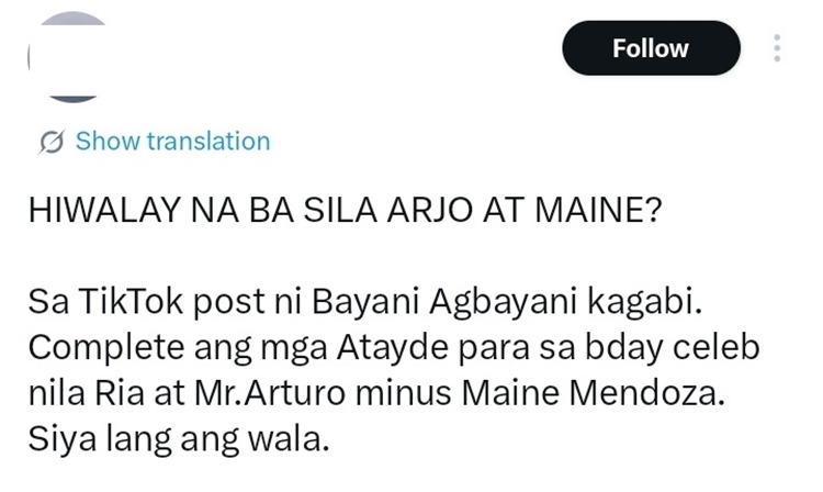 “HIWALAY NA BA SILA ARJO AT MAINE? Sa TikTok post ni Bayani Agbayani kagabi. Complete ang mga Atayde para sa bday celeb nila Ria at Mr.Arturo minus Maine Mendoza. Siya lang ang wala,” a netizen wrote.
