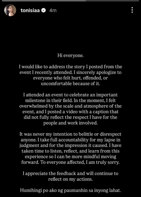 TONI SIA – The social media influencer issued a public apology after facing backlash over a viral video she shared from a recent event.