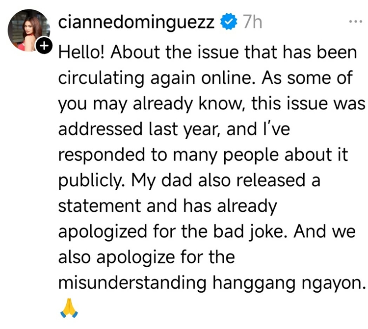 Cianne added that she and her family had already responded to the matter both publicly and privately. She recognized that not everyone may have seen their earlier responses. She also apologized for not being able to reply to each person individually, explaining that they believed the issue had already been resolved. She made it clear that this would be her final statement on the matter and thanked everyone for their understanding.