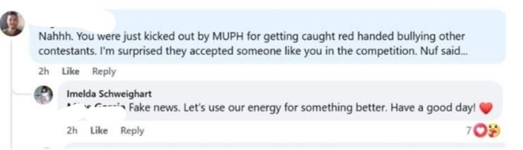 IMELDA SCHWEIGHART – The beauty queen has denied online claims that she was removed from the Miss Universe Philippines pageant due to misconduct, calling the allegations false and urging the public not to spread misinformation. She rejected reports that she was expelled for alleged bullying, stating that the issue is not true and was simply made up.