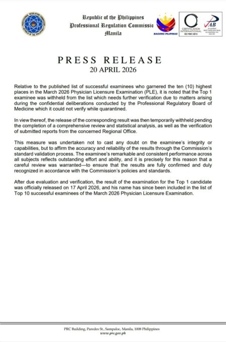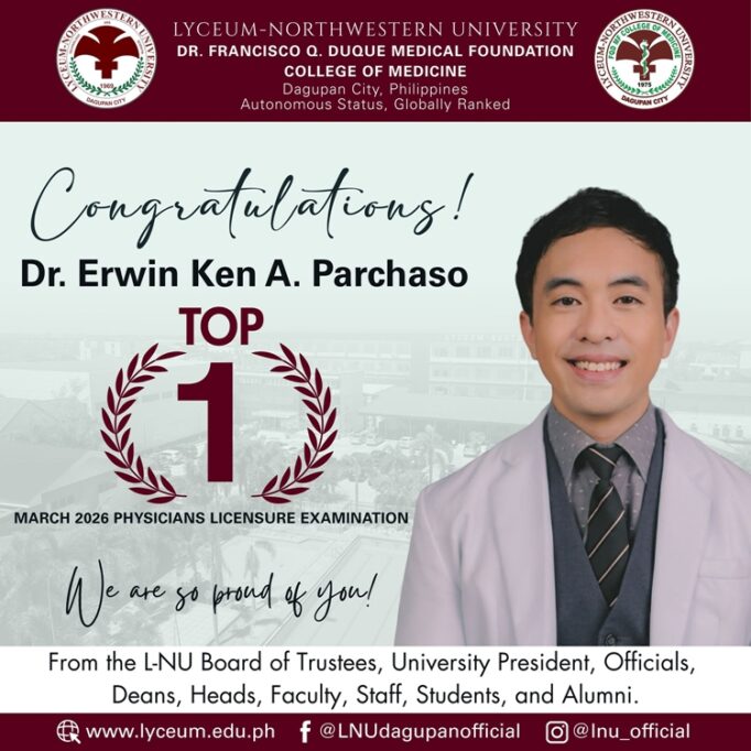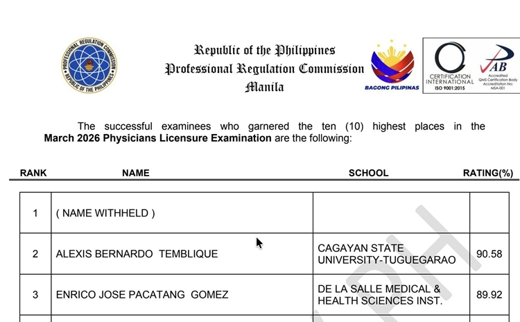 PRC – The Professional Regulation Commission has officially revealed the identity of the top examinee in the March 2026 Physician Licensure Examination after weeks of speculation. The top scorer, whose name was initially listed as “Name Withheld,” was confirmed to be Dr. Erwin Ken A. Parchaso from Lyceum-Northwestern University.